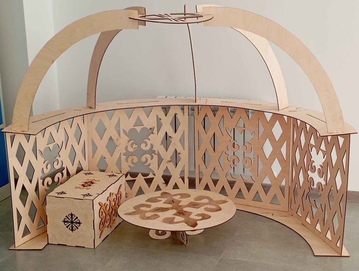 Декоративная юрта из фанеры представляет собой стильное интерьерное изделие, выполненное в национальном казахском стиле с высокой степенью детализации. Конструкция имитирует традиционную юрту, включая элементы кереге и шанырака, а также дополнена резными орнаментами, придающими изделию аутентичный и эстетичный внешний вид. Благодаря технологии лазерной резки достигается точность и аккуратность исполнения, что делает такую юрту отличным решением для оформления интерьеров, выставок, образовательных пространств и тематических мероприятий.